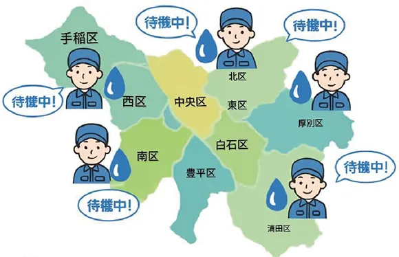 札幌市全域対応の水道修繕センター。水漏れ・つまり・排水管洗浄まで明朗会計で安心!水道局指定工事店が最短30分で駆けつけます。