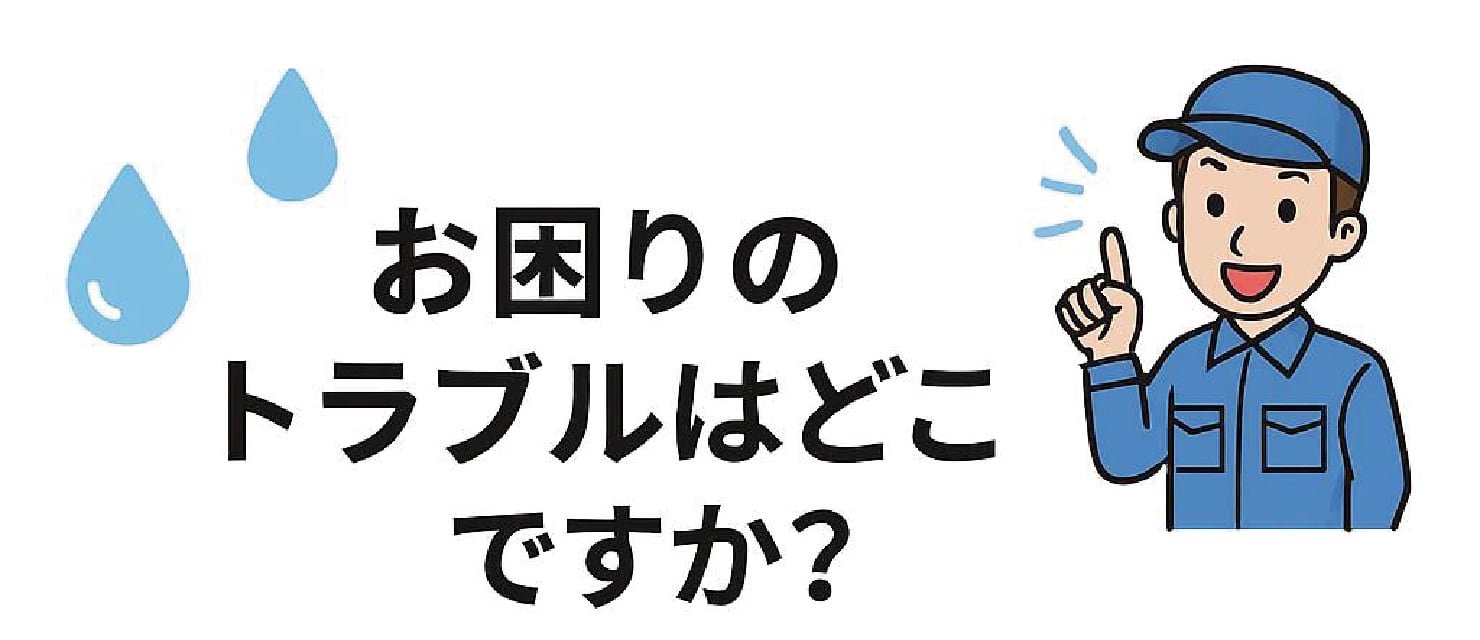 蛇口の水漏れや配管破損、トイレ・キッチン・洗面所・浴室のつまりなど、急な水道トラブルに年中無休で対応します。水道局指定の有資格スタッフが迅速・丁寧に作業し、出張費・見積料・キャンセル料はすべて無料です。軽微な修理は2,500円~と明朗会計で、初めての方も安心。詳しい料金や施工内容は、各トラブルページにて詳しくご案内しています。